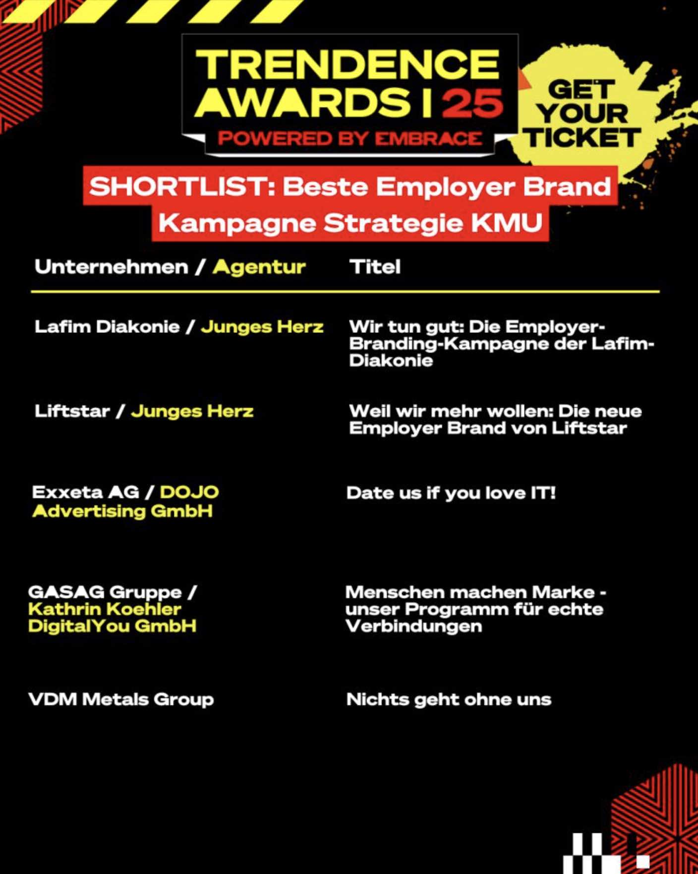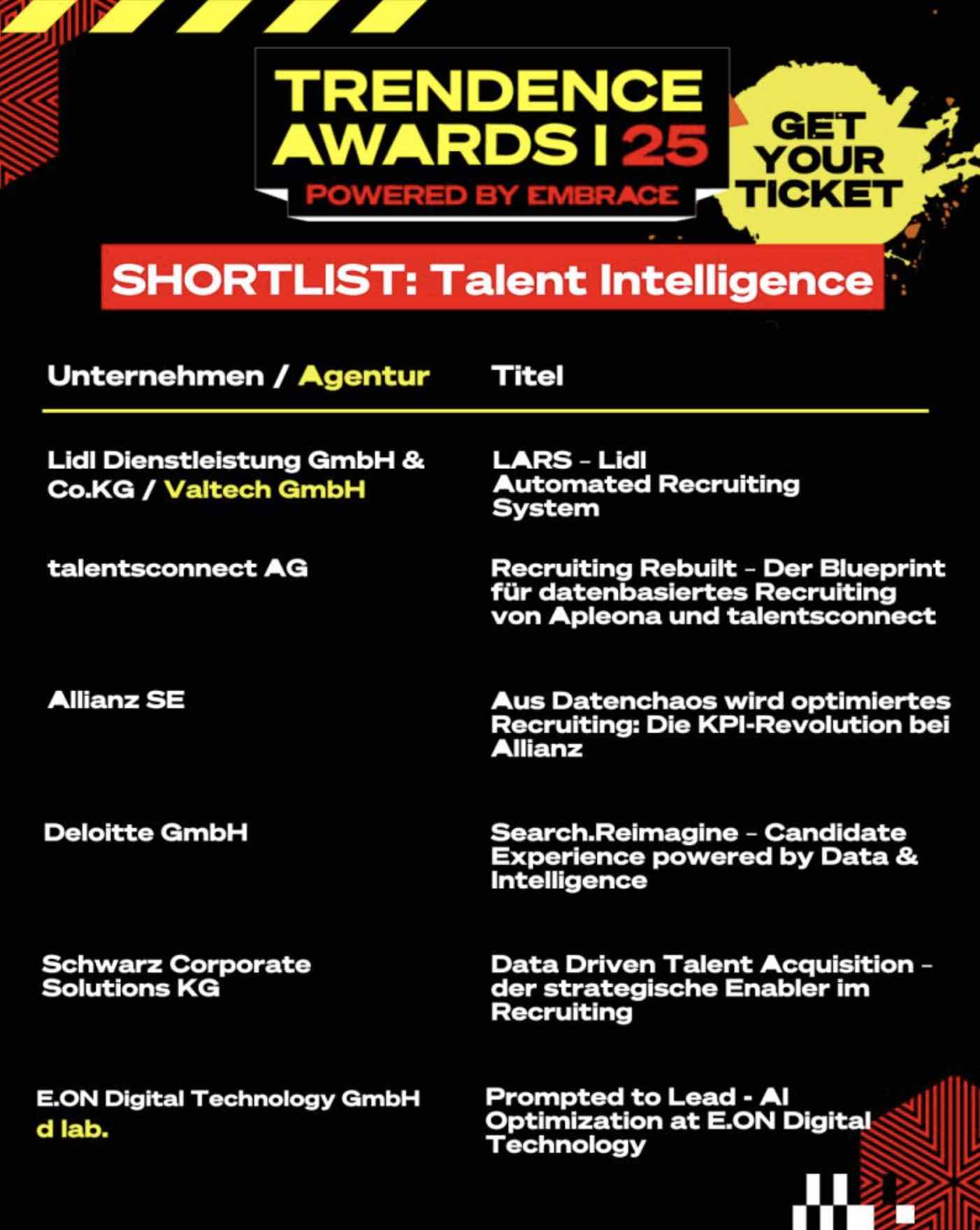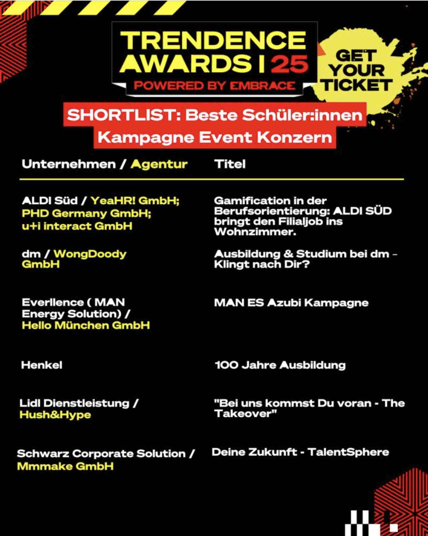 TRENDENCE Awards powered by EMBRACE: DIE SHORTLIST Teil1Die Shortlist ist da! – Am 6. November ist es soweit: im Magazin der Heeresbäckerei in Berlin werden die TRENDENCE Awards powered by EMBRACE vergeben. Aus 74 Einreichungen hat die Jury eine Shortlist aufgestellt. Alle Unternehmen auf der Shortlist pitchen am 6.11. live vor Publikum ihre Cases. => Das Publikum entscheidet dann, wer die begehrten Awards am selben Abend verliehen bekommt. Das Beste: jede/r kann dabei sein!Damit sind die Awards gleichzeitig die größte LEARNING JOURNEY, die man als HRler:in in diesem Jahr mitmachen kann. Mit Deinem Ticket sicherst Du Dir:
