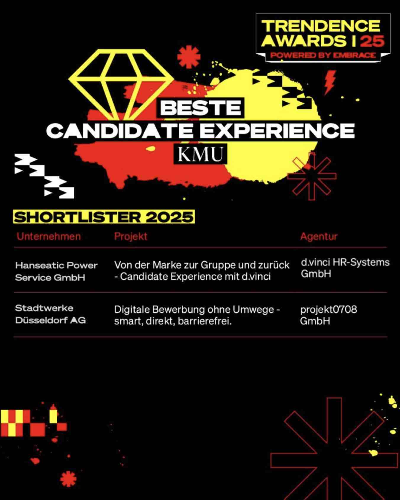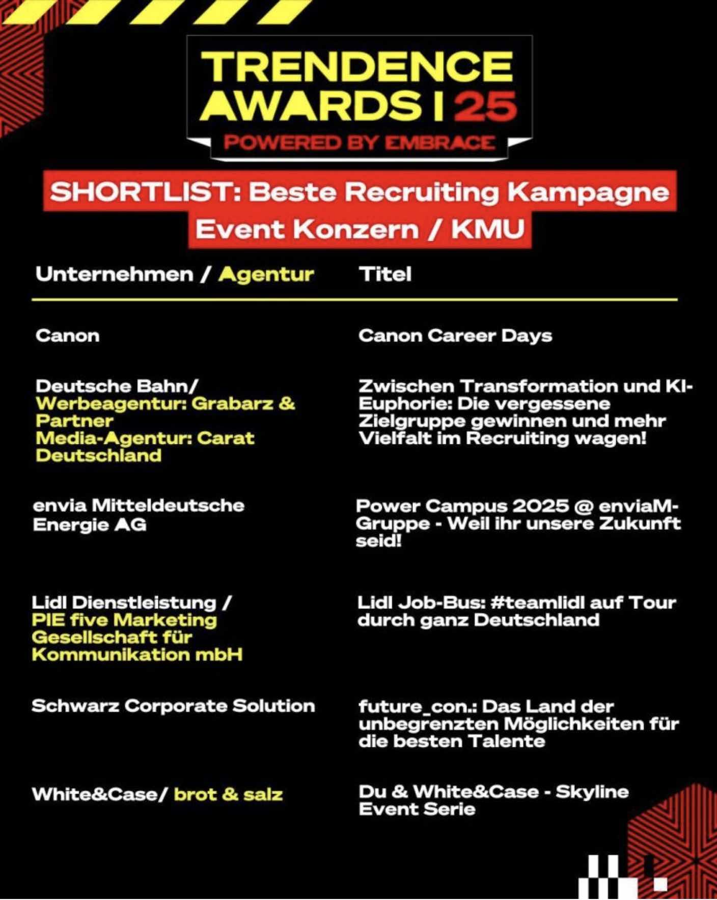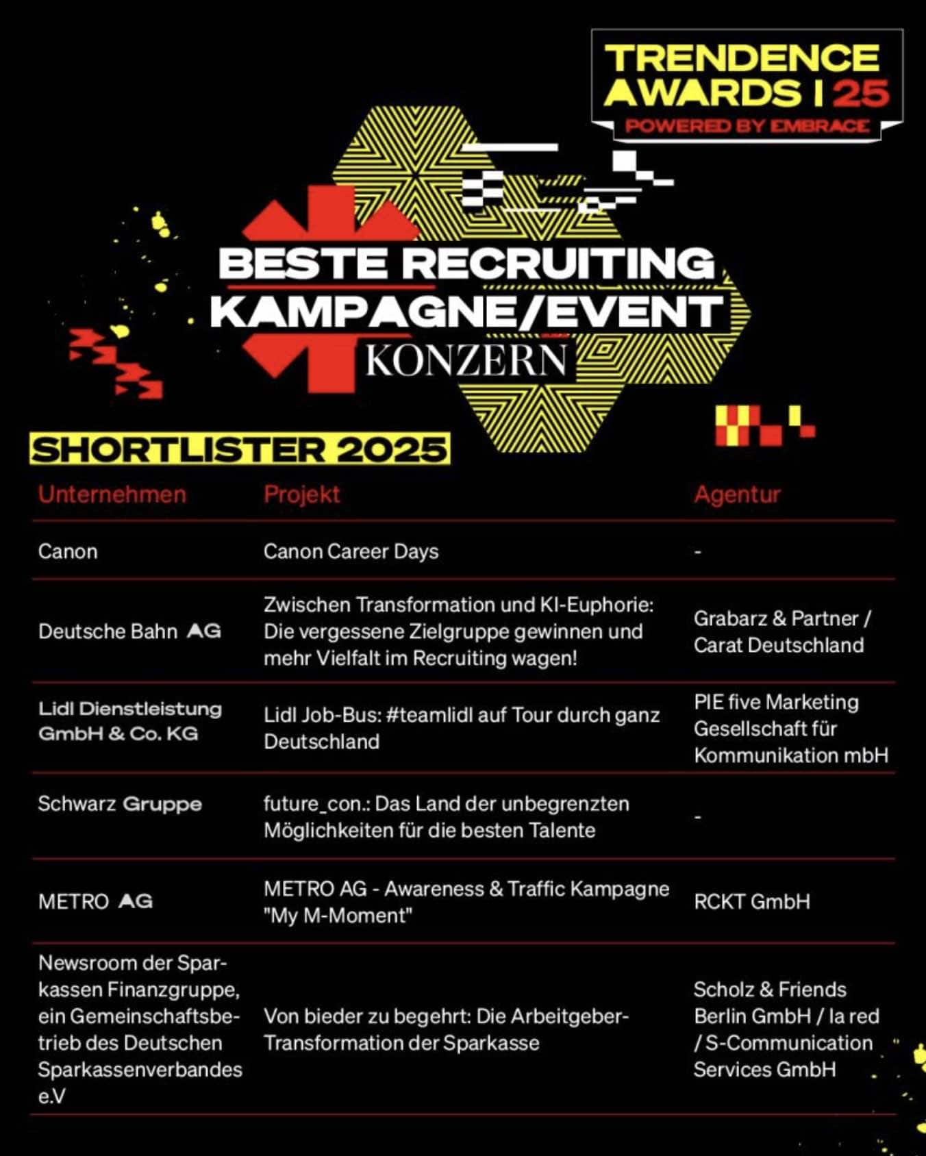 TRENDENCE Awards powered by EMBRACE: DIE SHORTLIST Teil1Die Shortlist ist da! – Am 6. November ist es soweit: im Magazin der Heeresbäckerei in Berlin werden die TRENDENCE Awards powered by EMBRACE vergeben. Aus 74 Einreichungen hat die Jury eine Shortlist aufgestellt. Alle Unternehmen auf der Shortlist pitchen am 6.11. live vor Publikum ihre Cases. => Das Publikum entscheidet dann, wer die begehrten Awards am selben Abend verliehen bekommt. Das Beste: jede/r kann dabei sein!Damit sind die Awards gleichzeitig die größte LEARNING JOURNEY, die man als HRler:in in diesem Jahr mitmachen kann. Mit Deinem Ticket sicherst Du Dir: